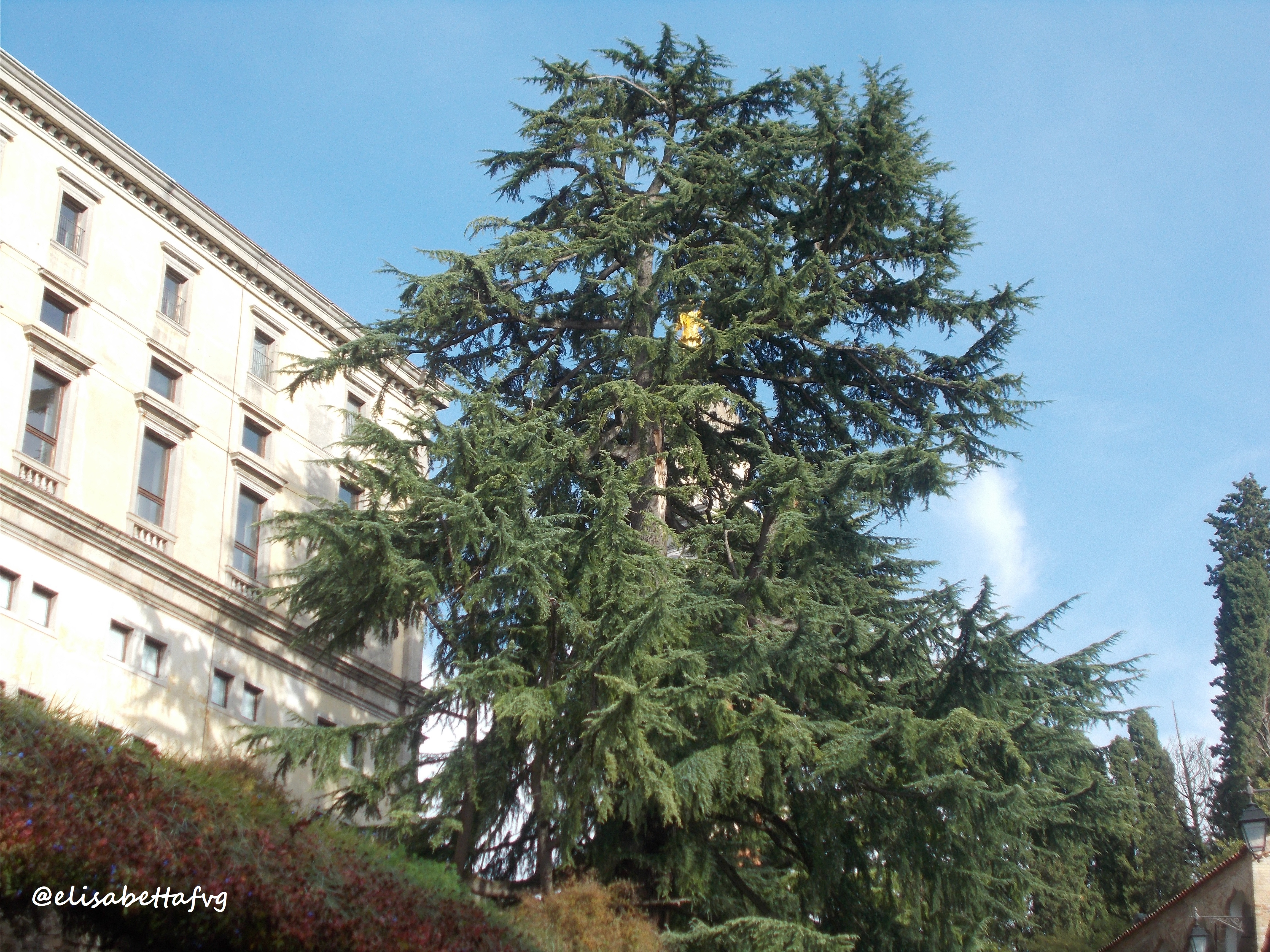 … mentre chi gioca a nascondino è proprio un Cedro: lo si nota in mezzo alle case, dal piazzale panoramico del Castello, guardando verso ovest … “se quella è via Zanon, quel palazzo è in via Poscolle … ma dov’è?” 🤔 … girovagando per il centro finalmente l’ho trovato ! E’ in un cortile privato, ben nascosto dalle case, è un albero timido, riservato … un pò come me!😊
